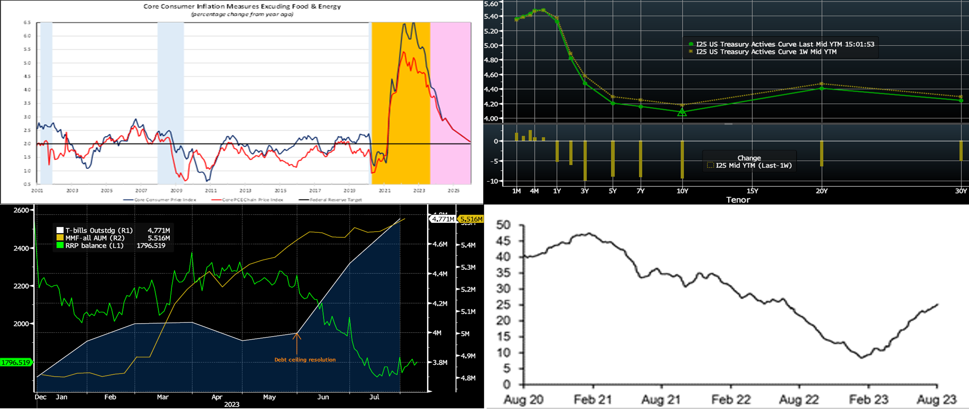 - Short-end rates were steady to a bit lower week-over-week, with the 2-month-and-in unchanged to a bp lower and the 3-month-and-out 2 to 4 bps lower. The market’s pricing of any further Fed hikes edged lower, thereby helping the small yield decline. Net T-bill supply remains robust and is expected to experience further upticks, given the recent announcements from Treasury regarding upsized auctions and issuance needs. But the supply has been absorbed well thus far as Money Market Funds (MMFs) switch from the Fed’s RRP to T-bills with competitive yields. Moreover, FHLB supply has subsided from peak levels of spring, further assisting T-bill interest from investors and thereby containing any severe upward pressure on rates from T-bill supply.