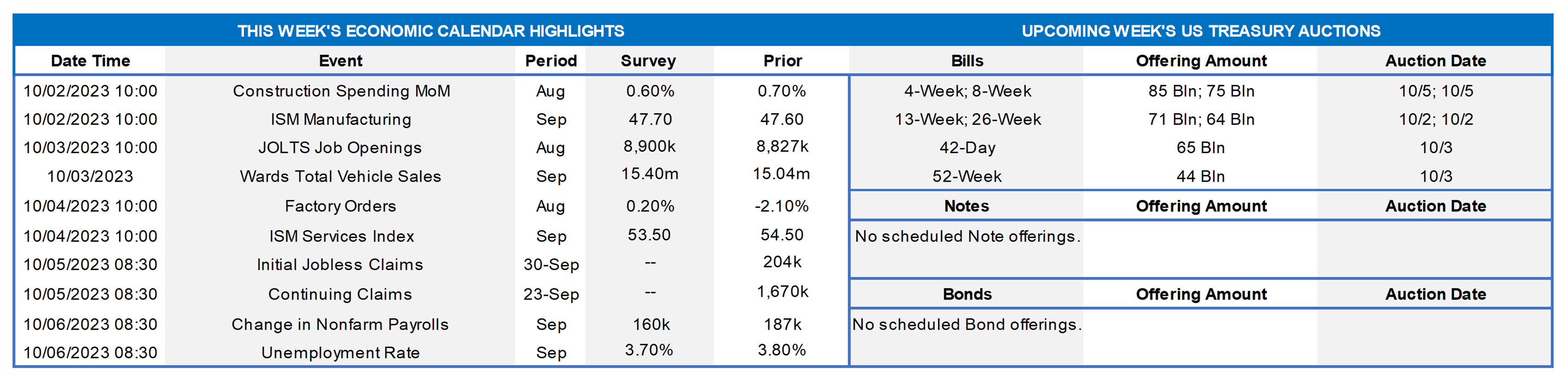 Source: Bloomberg. Top pane is yield (LHS, %), bottom pane is change (LHS, bps). From last Thursday afternoon to this one, the UST curve bear steepened, with longer tenors rising notably relative to shorter tenors. While the 2-year was roughly unchanged (roll-adjusted for the new on-the-run note), the 10-year rose ~10 bps. The post-FOMC “hawkish pause/higher-for-longer” theme, in tandem with a slug of fresh issuance and tepid demand out the curve, persisted over the week. The market will watch economic data, particularly the looming jobs report, but the threat of a government shutdown could impact/delay certain data collection and/or releases. In terms of market-implied pricing of the Fed, the 2023 peak Funds rate in December now stands at ~5.44%; essentially, the market is pricing a bit below the Fed’s dot plot with only ~45% chance of another 25 bp hike this year. The years 2024 and 2025 retreated from a week ago, with the year-end 2024 forward ~7 bps lower, at 4.60%.