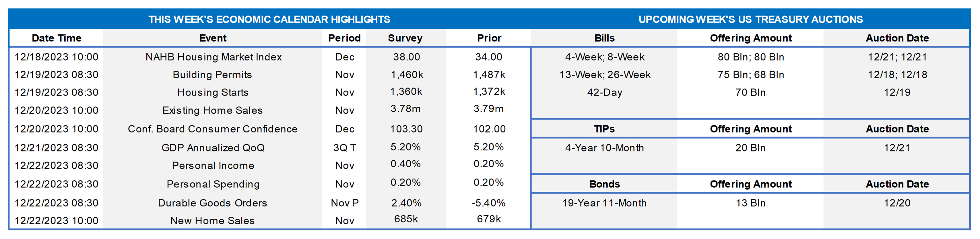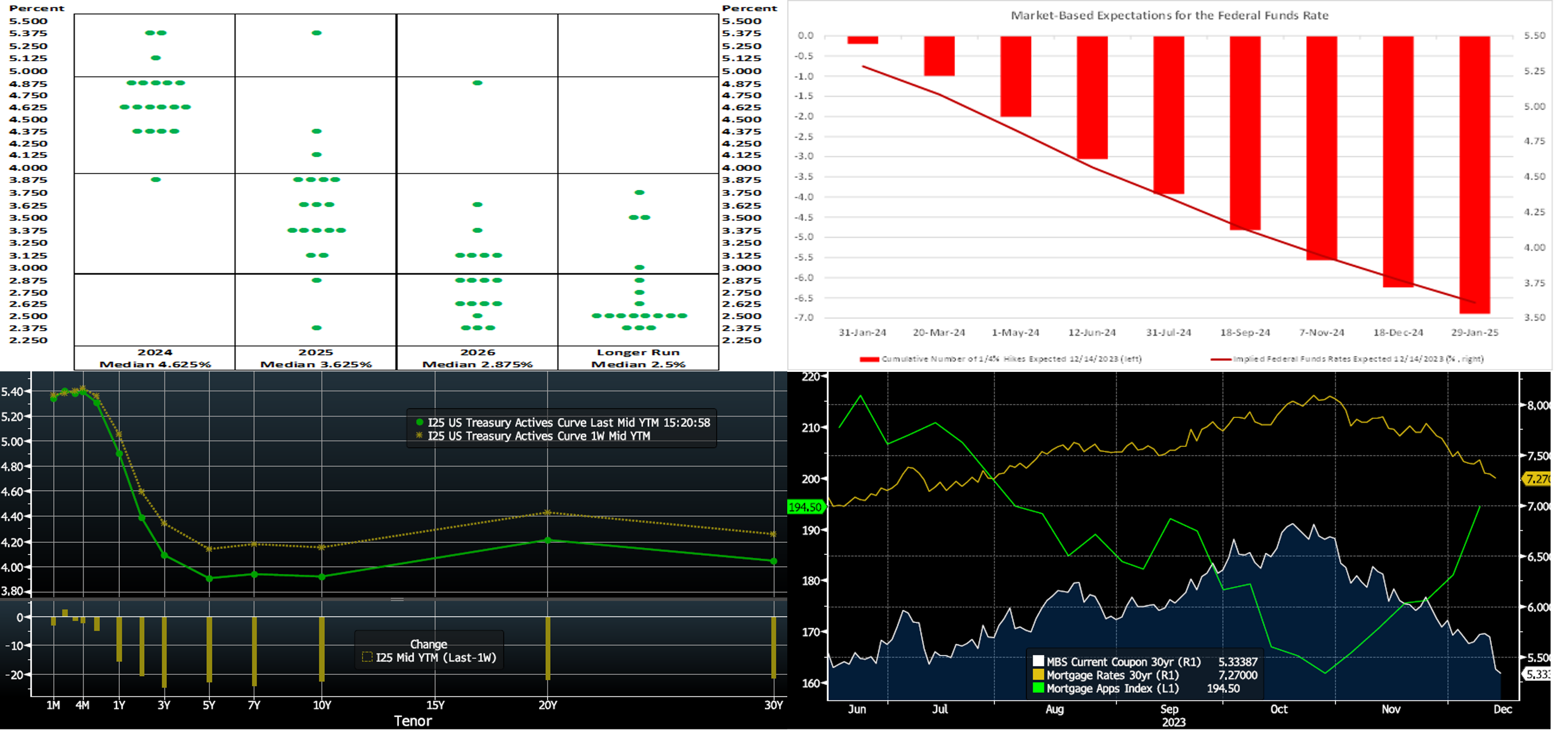 Source: Bloomberg; Board of Governors of the Federal Reserve System; FHLB-NY. As per the convention, the Federal Reserve Board also released an updated Summary of Economic Projections, or SEP. The so-called “dot plot”, seen here, contained significant changes to policymakers’ expectations for the federal funds rate target over the next two years. Fed officials now anticipate that the equivalent of three 25-bps cuts in administered rates are likely over the course of 2024, thereby leaving the target range at 4½% to 4¾% by yearend 2024. The median call for yearend 2025 now entertains the possibility of further rate cuts to 3½% to 3¾%. The median forecast for year-end 2026 stands at 2¾% to 3%. Market participants in aggregate, as priced into the yield curve, believe that the FOMC may begin easing monetary policy as early as March 2024 and anticipate significantly larger rate cuts, relative to the dot plot, that will leave the federal funds rate near 3¾% at end of 2024.