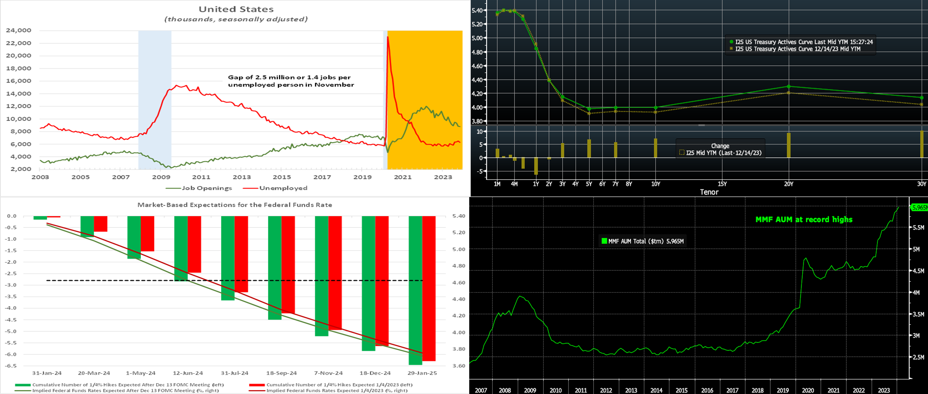 Source: Bloomberg. Money Market Funds (MMF) total AUM finished 2023 at record levels on a long-term historical basis, as seen here. AUM continued to increase in the last few months of the year along with the rally in bond and equity prices. History has shown that AUM can continue to increase through the initial stages of a Fed easing cycle, and so the upward trend in AUM may persist and continue to pose competition to bank deposits.