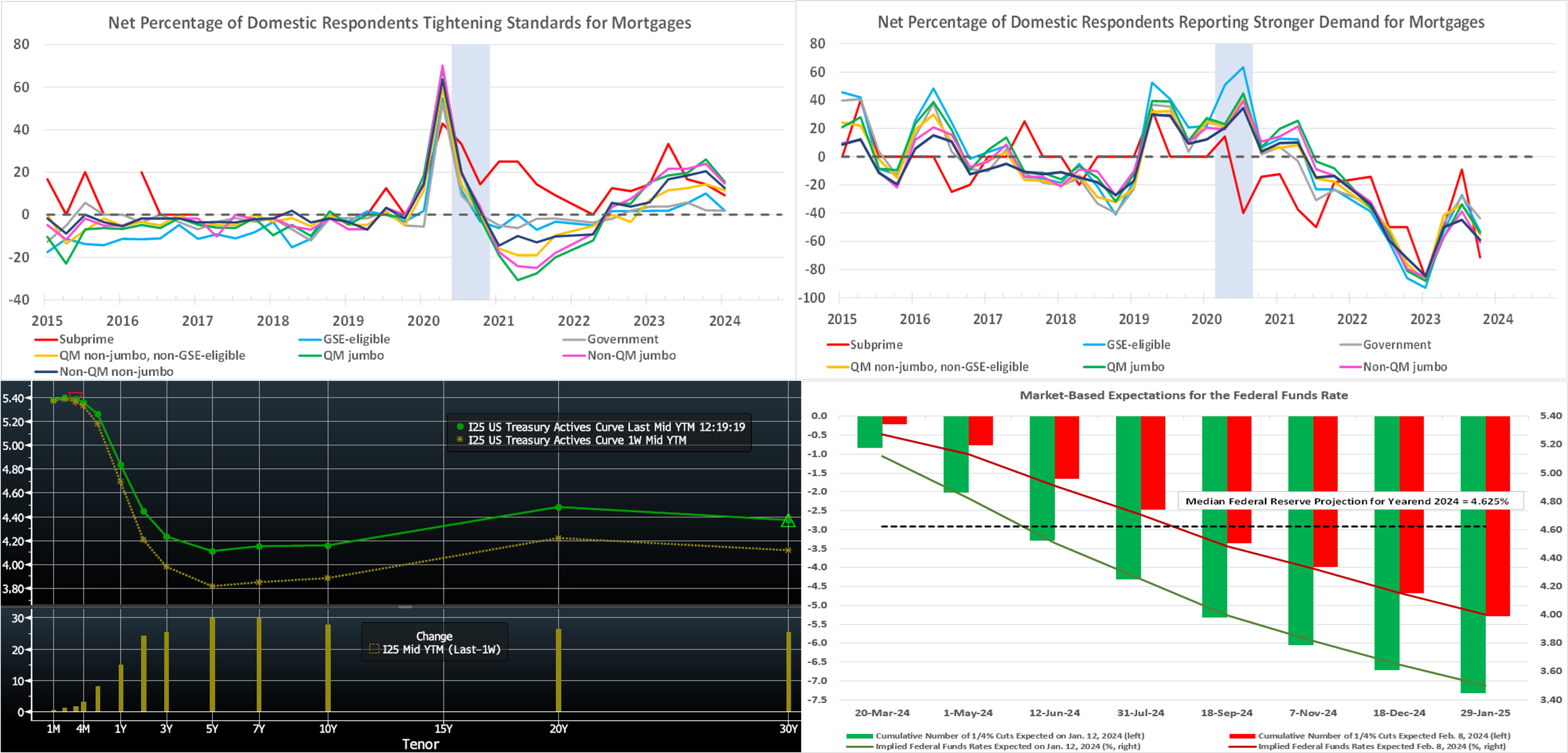 Source: Bloomberg. Top pane is yield (LHS, %), bottom pane is change (LHS, bps). From last Thursday afternoon to this one, the UST curve rose ~7 to 12 bps, with the 2- to 5-year sector leading the way. The main protagonist for the move was Tuesday’s higher-than-anticipated CPI report (details above) which instantly propelled yields higher. Subsequently, yields recovered from the highest levels of the week. Thursday’s weaker-than-expected retail sales report helped in this regard. In terms of market-implied pricing of the Fed, the chance of a 25 bps cut in March is ~7%, down from ~17% a week ago. The year-end 2024 forward is ~4.36%, roughly 21 bps higher than last Thursday. The market prices for a cumulative total of ~98 bps of cuts by the end of 2024, compared to ~118 bps a week ago. The upcoming holiday-shortened week is bereft of high-profile data, but the market will focus on the limited releases and any Fedspeak of note.