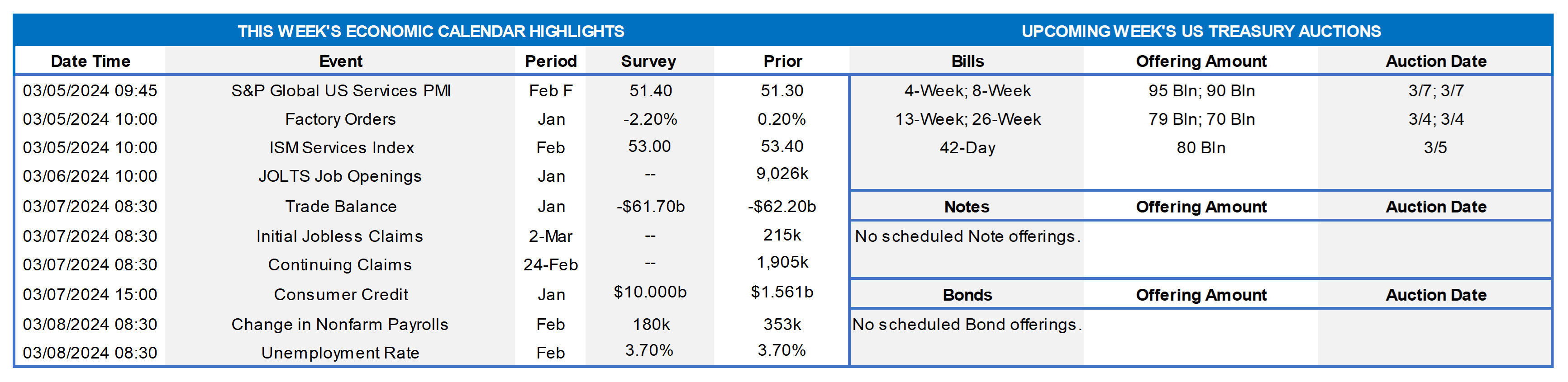 Market participants will face a heavy data calendar and public appearances by Fed officials this week. The marquee economic report will be Friday’s BLS’ update on the employment situation in February. Labor market conditions likely remained extremely tight last month. Recent soundings on initial and continuing jobless claims point to a 250K rise in nonfarm payrolls, after a pair of 300K-plus leaps in November and December. Due to an extremely favorable shift in weather conditions between the January and February establishment survey periods, however, that projection could prove too low. The number of persons unable to work because of inclement weather clocked in at 553K in January, double the average witnessed over the prior ten years for that month. Total private hours worked – a closely followed proxy for nonfarm business output – likely will rebound during the reference period, erasing the .3% January decline. The unemployment rate is expected to hold steady at 3.7% for a fourth straight month. Some relief may be in the offing on the wage inflation front. Average hourly earnings probably edged just .1% higher last month, following the outsized .6% hike at the beginning of 2024. Despite the anticipated slowdown, average hourly nominal compensation would be 4.5% above the level of a year ago. While handful of policymakers, including four current FOMC voters, will hit the lecture circuit, the highlight will be Chair Powell’s delivery of the Federal Reserve’s Semi-Annual Monetary Policy Report to Congress.