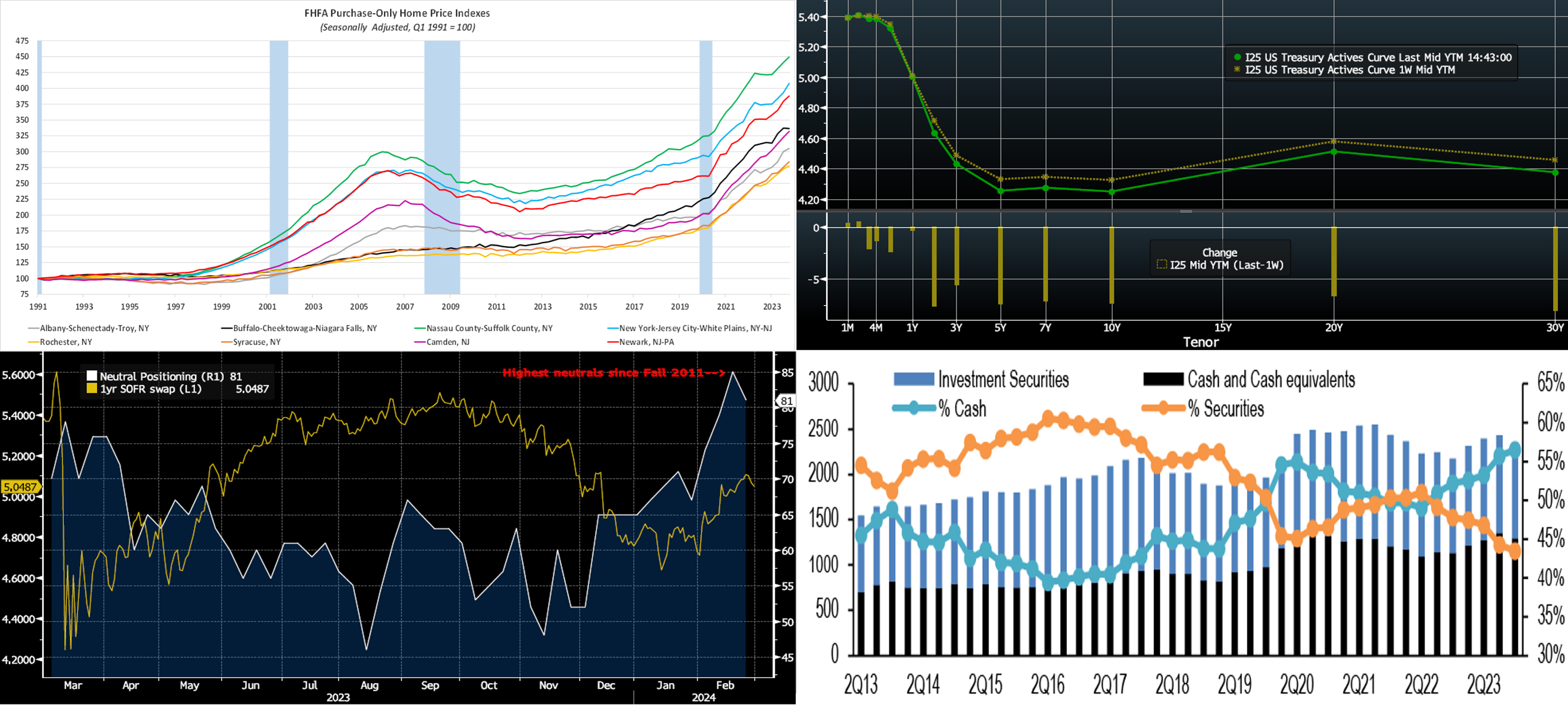 Source: FHFA; FHLB-NY. Note: Blue shaded areas denote recessions. Home selling prices continued to climb across virtually all major metropolitan areas within the FHLB-NY district during the final quarter of 2023. The average price increase witnessed over the October-December span was 2.1%, down from 3.3% over the summer. Over the course of last year, home prices rose by 10.2% on average, following an 8.8% gain in 2022. Enjoying a hefty 13% jump, the Camden, NJ area recorded the largest increase in home-selling prices in 2023. At a comparatively modest 6.7%, Nassau and Suffolk counties posted the smallest. Over the past three years, canvassed areas within the FHLB-NY coverage area have seen home prices rise at an annual rate of 10.8% on average. Likely helping to support prices has been the multi-decade low levels of existing home inventories in recent years, although inventories have risen off the lowest levels of roughly two years ago. Also, note that mortgage rates fell markedly in Q4 2023 from a high of ~7.90% in mid-October to ~6.75% in late-December.