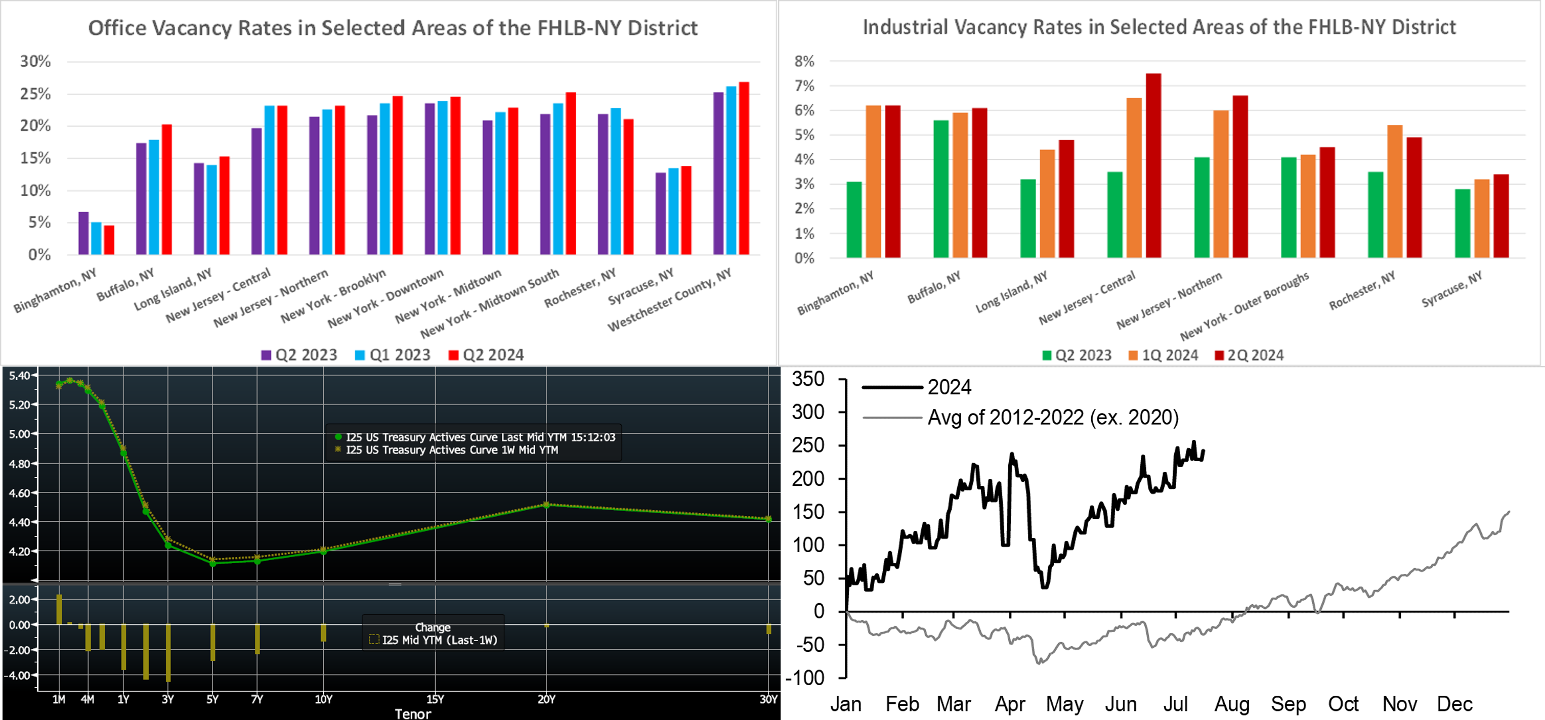 Source: Bloomberg. Top pane is yield (LHS, %), bottom pane is change (LHS, bps). As of Thursday afternoon, the UST term curve was slightly lower than a week ago, with the 3-year down ~4.5 bps to lead the modest move. The tone of Fedspeak during the week was generally supportive of the soft-landing scenario. For instance, Fed Vice-Chair Williams noted that inflation data and signs of labor market cooling indicate that inflation could be moving sustainably to the 2% goal. In terms of market-implied pricing of the Fed, there is now ~98% cumulative chance of a 25 bps rate cut priced for the September 19th FOMC; the November meeting is at 160%, up a tad from 156% a week ago. The year-end 2024 forward is now ~4.70%, or about 2 bps lower than last week, thereby implying a cumulative total of ~63 bps of cuts by the end of this year. With the Fed in blackout mode before its end-of-month meeting, the market will monitor data for direction.