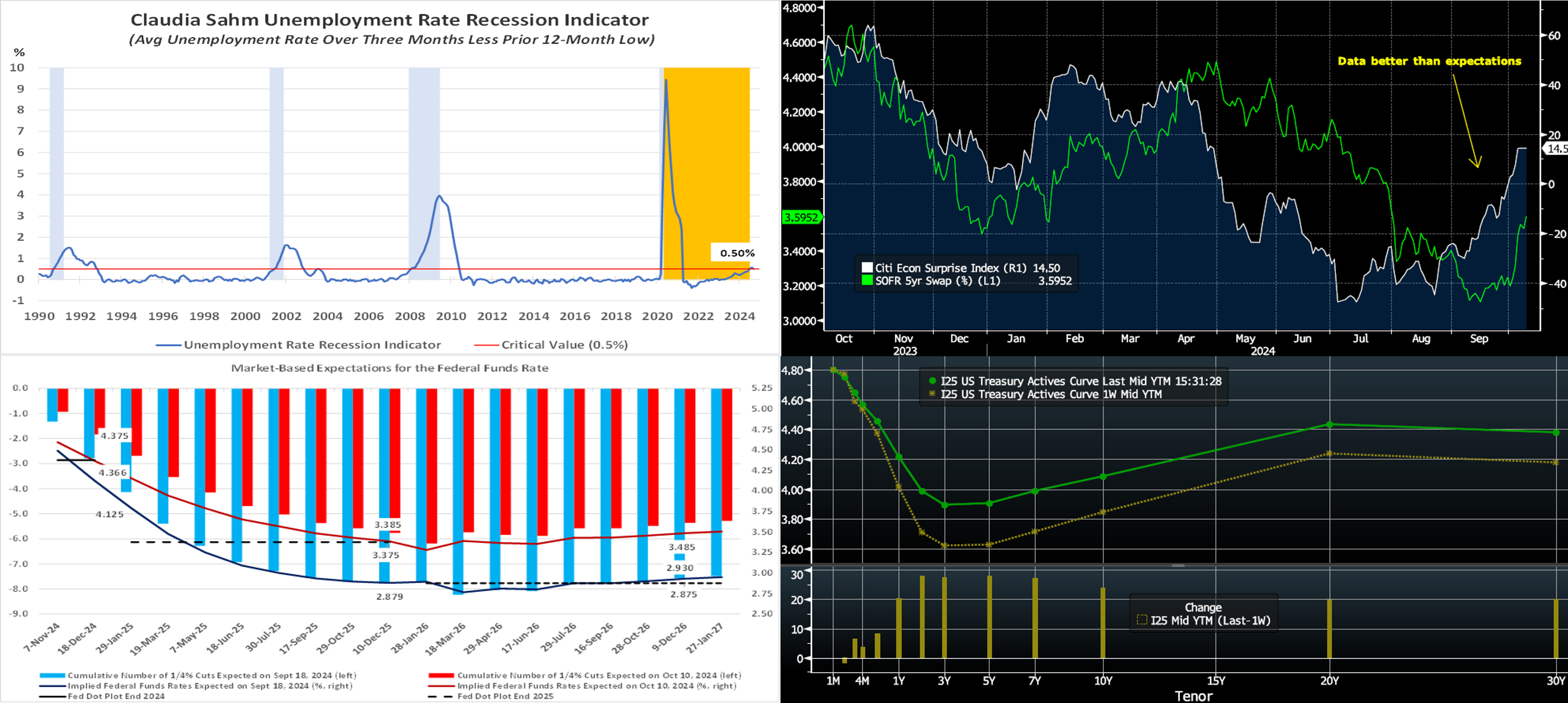 Source: Bloomberg. Much like the employment situation report cited above, economic data in general over the past month has registered at better-than-expectations levels, as seen here in the recent rise of the Citibank Economic Surprise Index (White, RHS). This dynamic has, in turn, instigated a backup in rates, as seen here in the 5-year SOFR swap rate (LHS, %), which has risen ~45 bps since mid-September. Note that data can beat expectations for a mix of reasons; for instance, the data may be truly robust, or economists may be marking forecasts lower, or perhaps a bit of both.