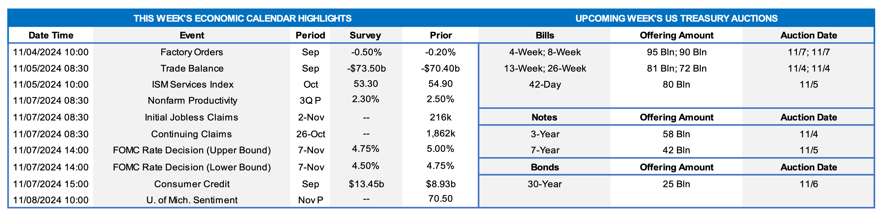 - The market will focus on the upcoming FOMC and elections. Fedspeak will be in blackout mode until the FOMC release.