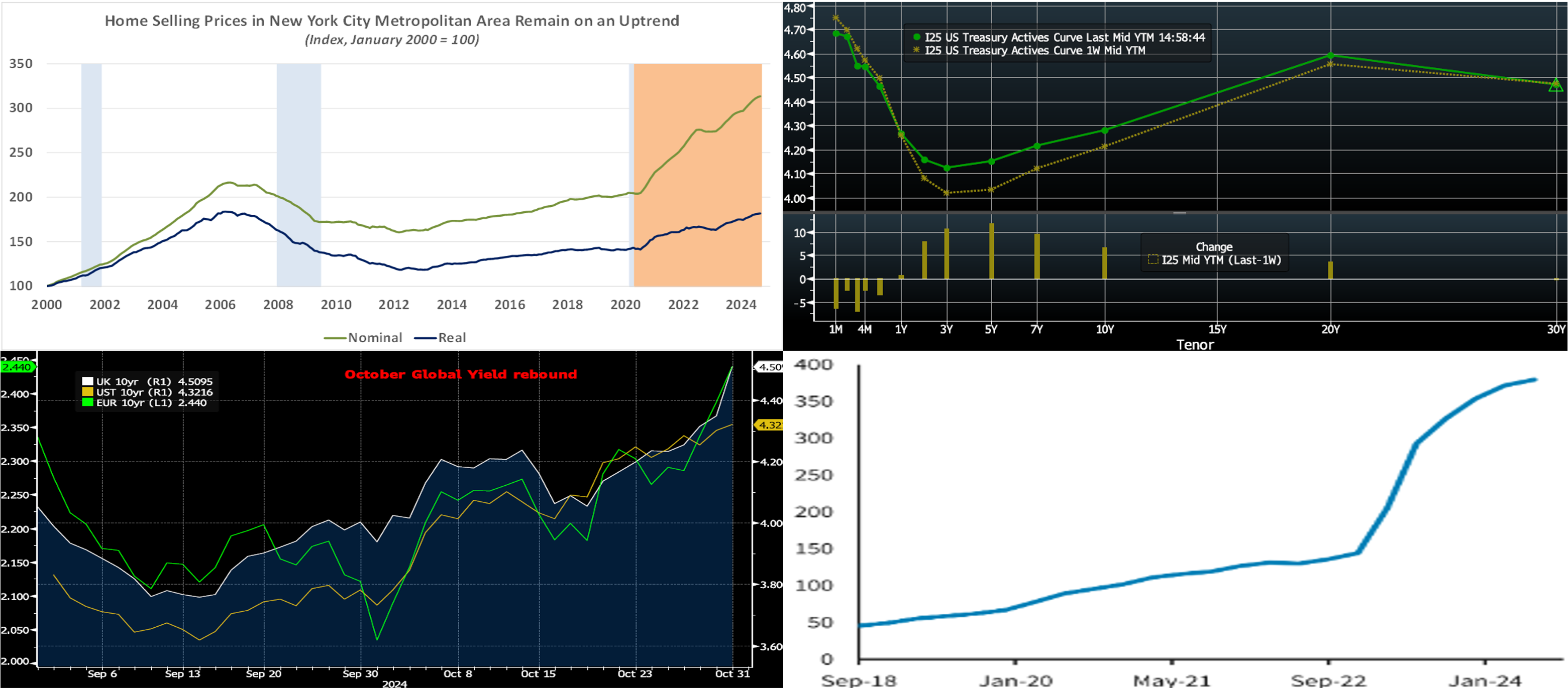 Source: Bloomberg. The notable rebound in yields in the past month has not been in a vacuum, as global investors have pushed yields higher across multiple large bond markets. Here can be seen, as of midday Thursday, the rise in not only the 10-year UST yield (Gold, RHS, %) but also that of the UK 10-year (White, RHS, %) and Euro 10-year (Green, LHS, %). While the UST has risen ~67 bps from its mid-September level, the UK yield has increased by ~75 bps since mid-September and the Euro yield by ~40 bps since end-September. These observations serve as a reminder that global bond markets can be interconnected, with many of them sharing similar themes related to budget deficits and debt issuance levels.