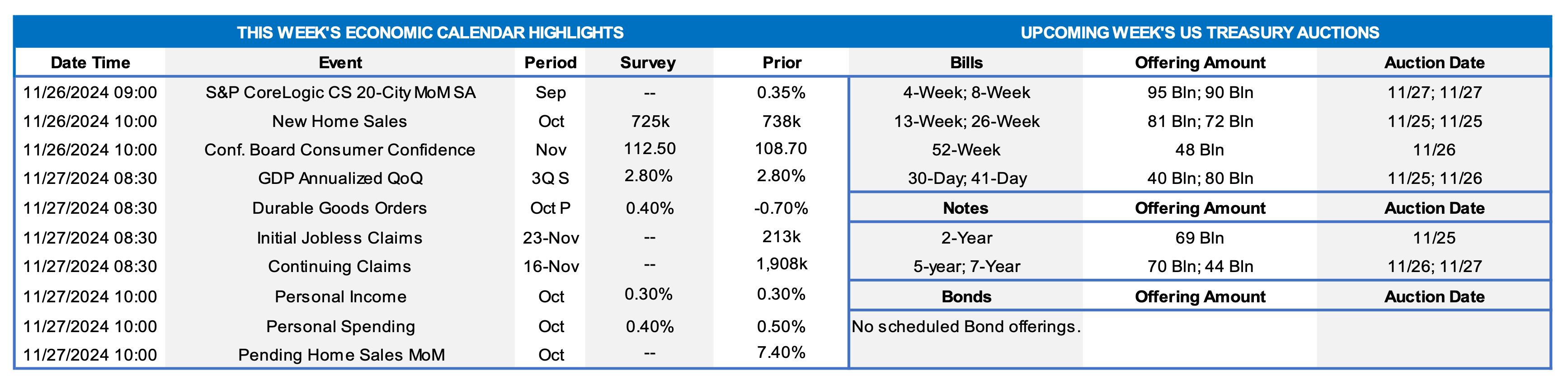 - Nov. 26 Federal Reserve to release minutes from November 6-7 FOMC meeting.