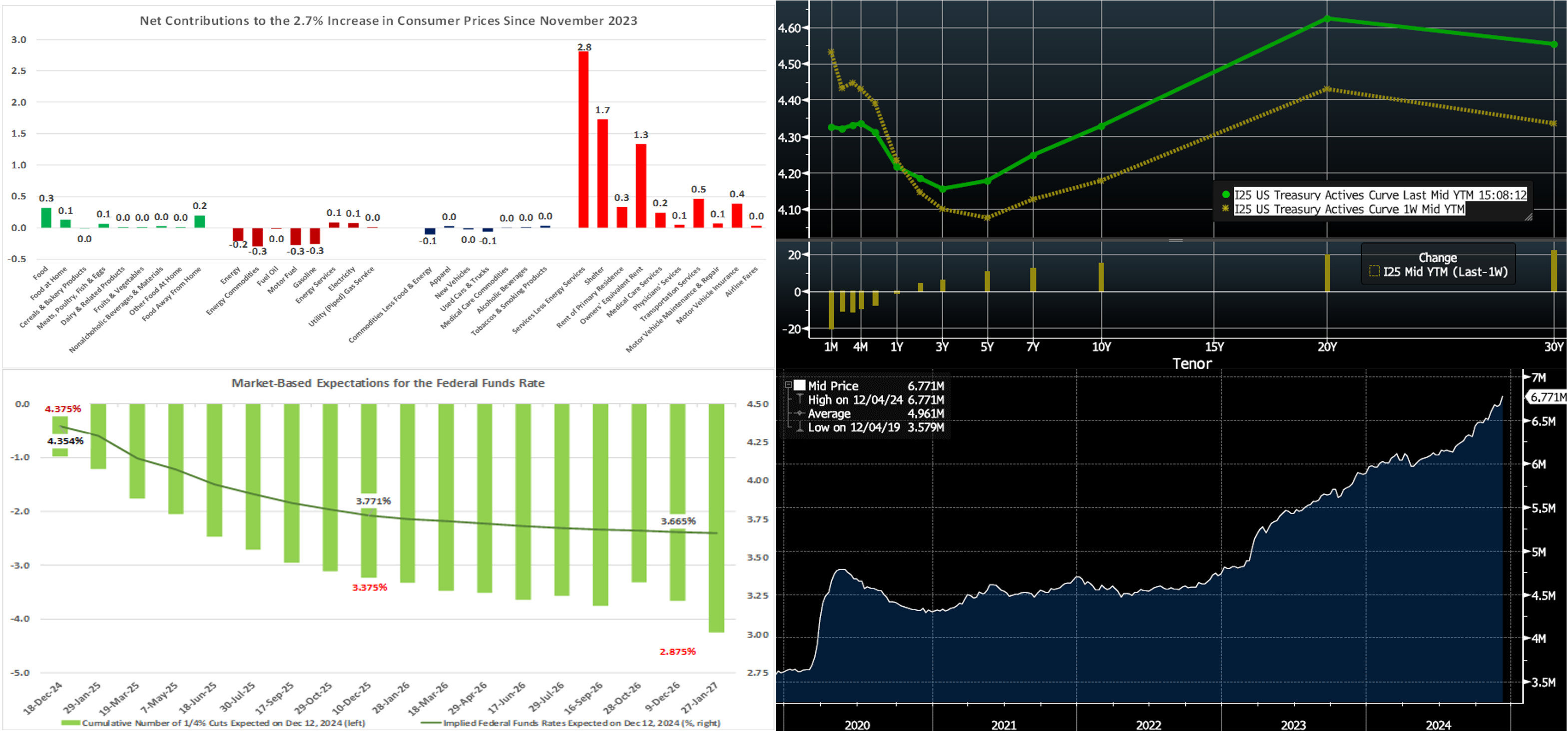 Source: Bloomberg. Top pane is yield (LHS, %), bottom pane is change (LHS, bps). As of Thursday afternoon, the UST term curve was higher and steeper than a week ago. The 2-year was ~5 bps higher, while the 5 and 10-year were ~10 and 14 bps higher, respectively. The week was limited data-wise; the CPI report met expectations, and so, despite the evident slowing of disinflationary forces in the past few months, it essentially solidified the odds of another 25-bps cut by the Fed this upcoming week. In terms of market-implied pricing of the Fed, for end-2024, the market forwards price for Fed Funds is ~4.355%, or ~6 bps lower than a week ago. The market prices end-2025 ~3.77%, or ~3 bps higher than last week and still well above the Fed’s last median projection from its September FOMC meeting of 3.375%. The market’s end-2026 forward is ~3.66%, ~10 bps higher than last week, which is clearly higher than the Fed’s September long-run projection of 2.875%.