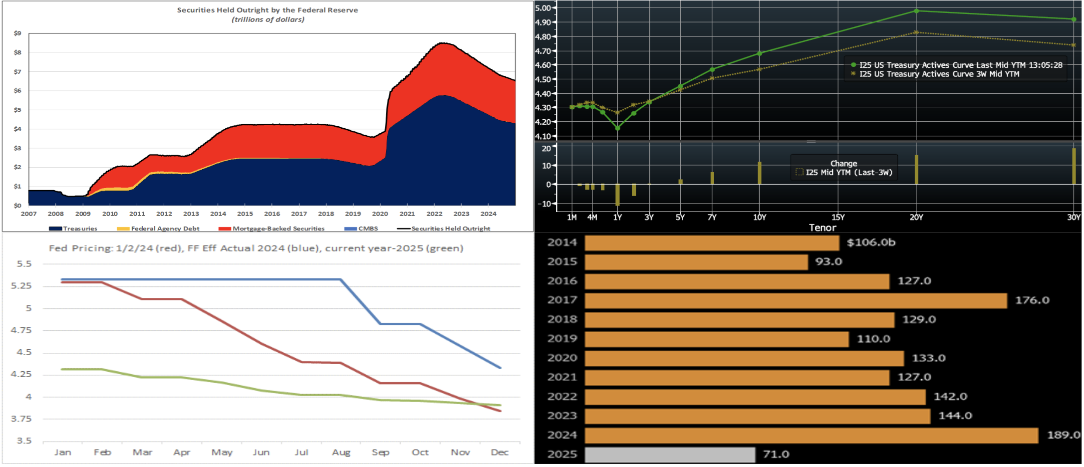 Source: Bloomberg. Top pane is yield (LHS, %), bottom pane is change (LHS, bps). As of Thursday afternoon, the UST term curve was notably steeper from the time of our last edition three weeks ago. Whereas the 2-year is ~5 bps lower, the 5 and 10-year are higher by ~2 and 12 bps, respectively. The steepening in the curve is partially a reflection of concerns about lingering inflation forces and uncertain potential tariff policy impacts in the year ahead. In this week’s release of the December FOMC Minutes, Fed officials noted potential “risks of higher-than-expected inflation”. The Friday jobs report and next week’s inflation reports will be potential market-movers. The market prices end-2025 fed funds ~3.91% which equates to less than two 25-bps Fed cuts. The market’s end-2026 forward is ~3.95% which is clearly higher than the Fed’s December FOMC median projection of 3.375%.