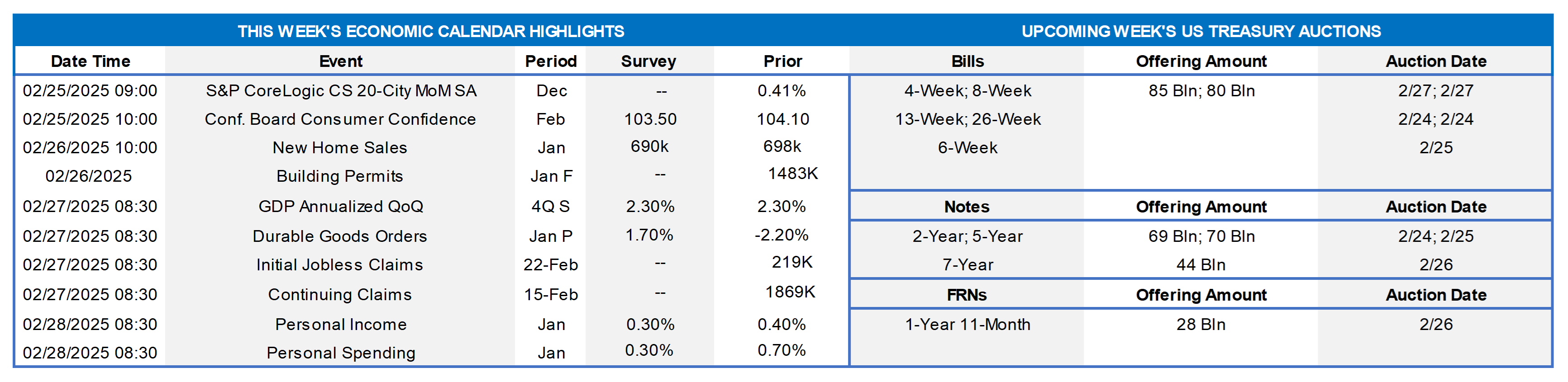 Market participants will contend with a crowded calendar of decidedly mixed economic releases in the upcoming week. Contracts to purchase a home likely rebounded at the end of last year, but prices received by sellers in major metropolitan areas slowed. Concerns about current economic conditions and prospects for the balance of 2025 probably weighed heavily on consumers’ spirits in February. Commercial aircraft bookings are expected to have propelled durable goods orders sharply higher in January. Labor market conditions likely remained tight in mid-February, setting the stage for a solid jobs report for this month. Roughly half a dozen Federal Reserve officials are scheduled to make public appearances this coming week.