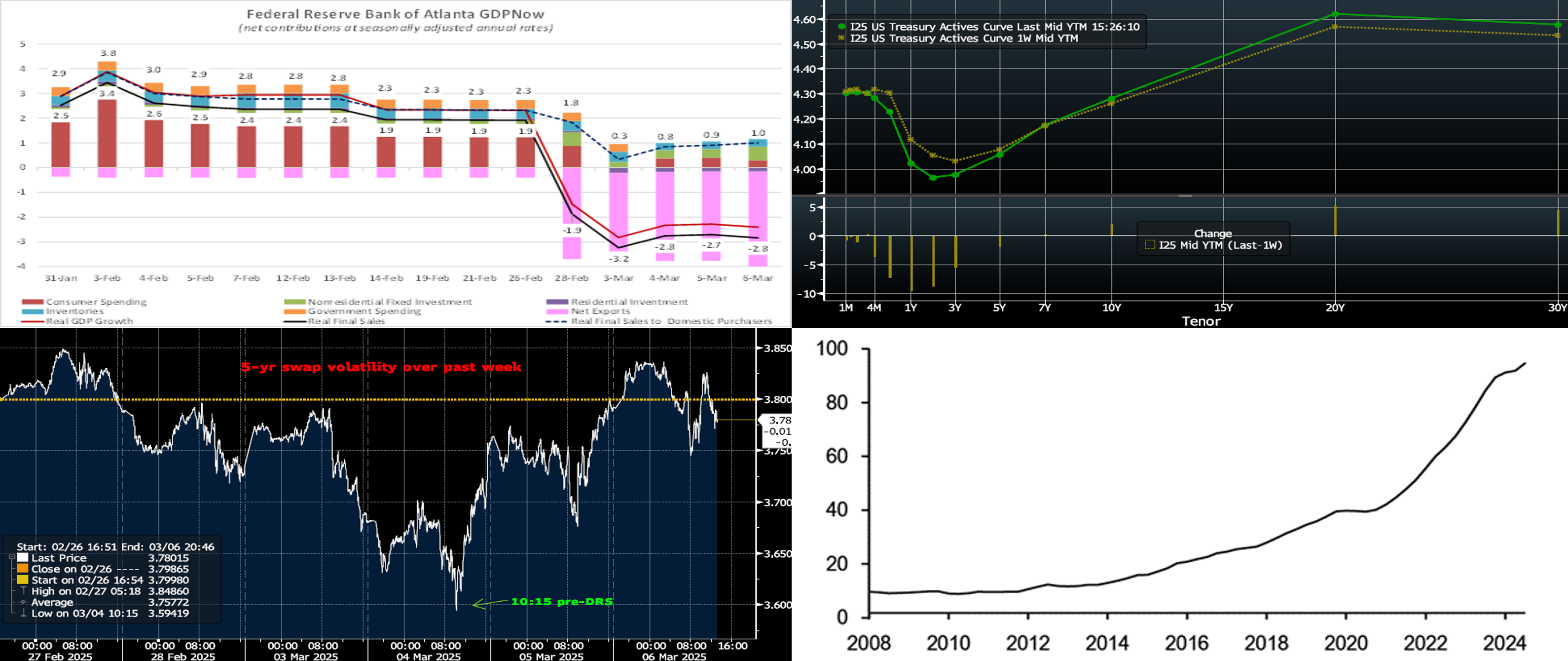 Source: Bloomberg. While the saga continues albeit somewhat calmer on account of implementation delays, the White House Administration’s tariff announcements this past Tuesday sparked significant market volatility. Indeed, as can be seen here in the form of the 5-year swap (RHS, %), yields plunged in initial reaction to the news and to the selloff in stocks. Indeed, the 5-year swap fell to just shy of 3.60% mid-morning before subsequently retracing higher. The move prompted some opportunistic borrowers to take advantage of term and putable advances at more advantageous levels. As a reminder, note that our rates track market levels and that we are open and ready for borrowings well before the Daily Rate Sheet (DRS) hits members’ inboxes and when rates may have changed. We encourage members to call the desk for rate and/or market updates and thereby potentially achieve more advantageous funding levels.