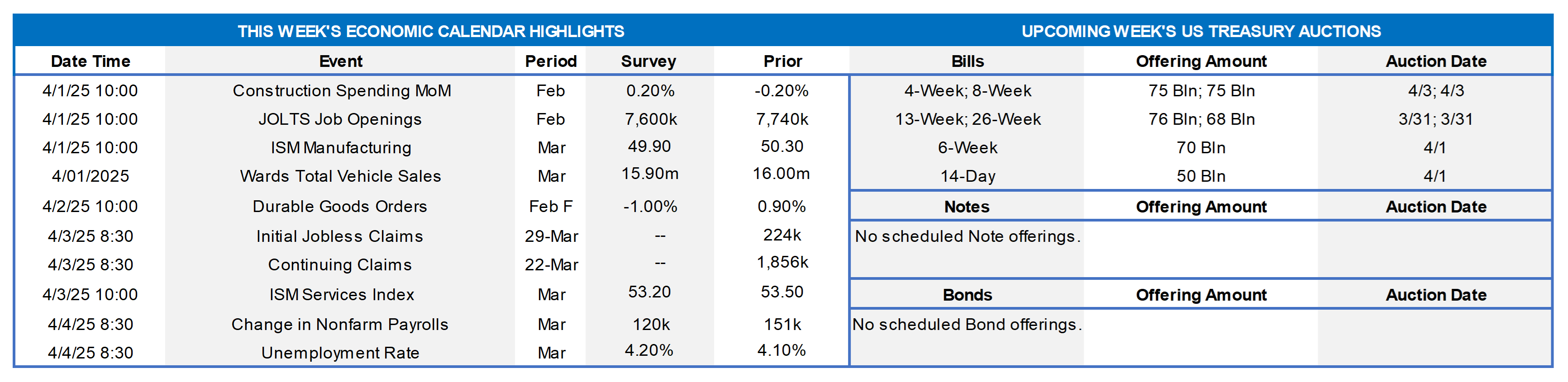 - On the UST term supply front, the upcoming week serves as a reprieve from auctions. Note that UST auctions usually occur at 1pm and can occasionally spur volatility around that time. Please contact the Member Services Desk for further information on market dynamics, rate levels, or products.