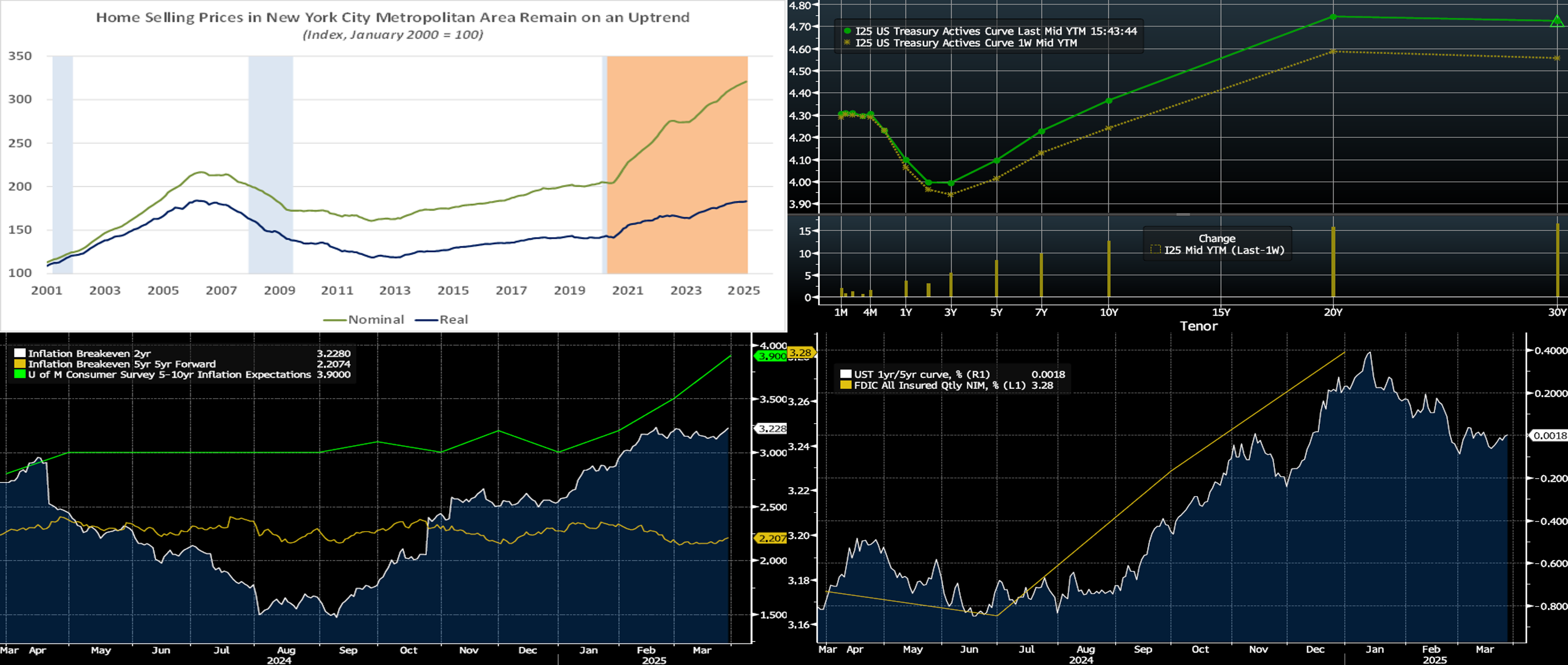 Source: Bureau of Labor Statistics; National Bureau of Economic Research; S&P CoreLogic Case-Shiller; FHLB-NY. Notes: Blue-shaded areas denote recessions; orange-shaded area highlights the current economic expansion. Home selling prices remained on an uptrend across the NYC metro area at the beginning of 2025. S&P CoreLogic Case-Shiller (SPCLCS) reported that local home prices rose by .6% to a record 320.8 (January 2000 = 100) in January, boosting the cumulative increase since February 2023 to 17%. At 7.8%, the rise in local home prices over the last 12 months was the largest among the 20 major metropolitan areas canvassed by SPCLCS and eclipsed the 4.7% average by a wide margin. After adjusting for consumer prices, excluding shelter costs, the picture, although positive, is less steamy. Real home prices in the NYC area climbed by 0.3% during the reference period and have advanced by 4.6% over the last 12 months. Of note, real home prices in January stood just .5% below the peak posted before the Great Recession in March 2006.