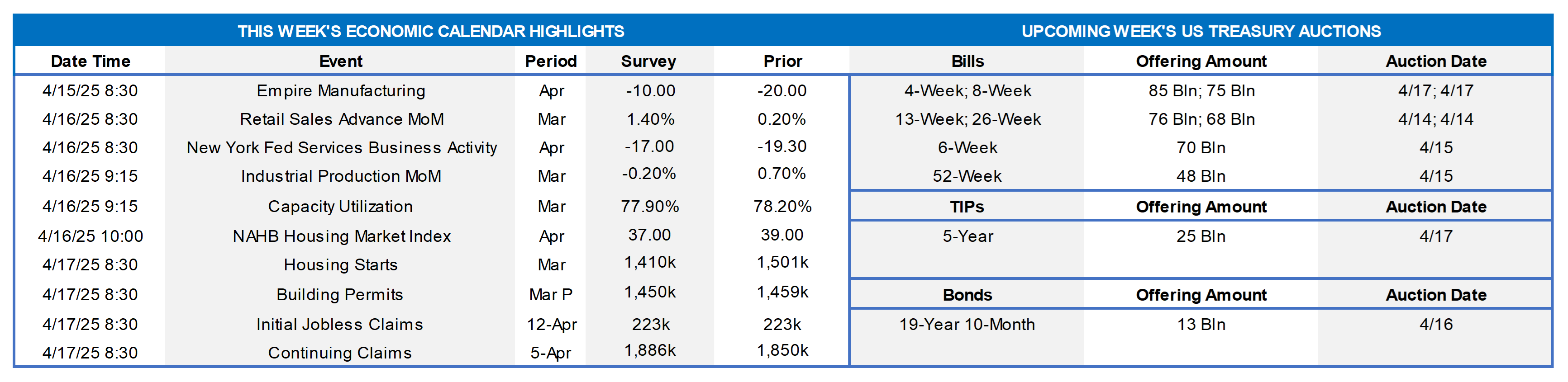 - As of Thursday afternoon, short-end rates were mixed, and the curve was flatter vs. a week ago. The 3-month-and-in sector was 1 to 8 bps higher, led by the Overnight, while the 4- to 6-month sector was 2 to 6 bps lower, led by the 6-month. The shortest tenors experienced impacts from lingering tighter overnight repo markets as well as some widening of credit spreads amidst the tariff drama. As of this writing, after the tariff partial pause, these dynamics had cooled from their most severe on Wednesday. Meanwhile, the market’s repricing of potential Fed cuts this year spurred downward movement in the longer tenors. Despite some wavering this week, robust Money Market Fund AUM levels have helped underpin demand for short-end paper. Also helpful is that net T-bill supply has been negative in recent weeks, owing to debt ceiling dynamics. But with the April 15th tax date quickly approaching, MMFs and bank deposits may be susceptible to withdrawals in the near-term.