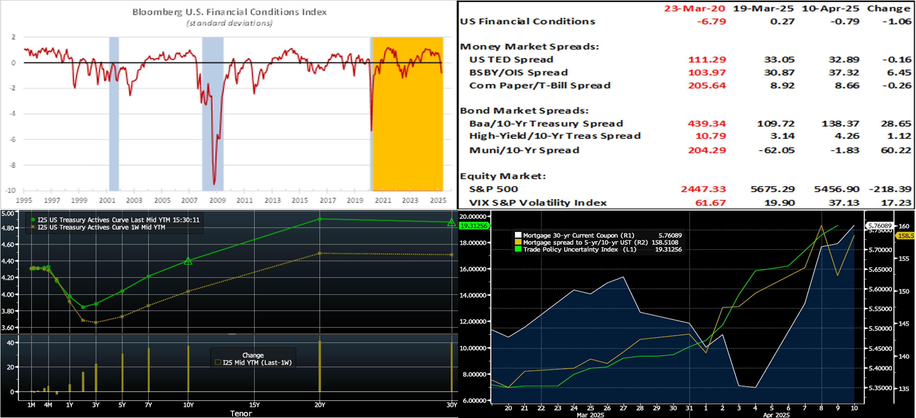 Source: Bloomberg. Top pane is yield (LHS, %); bottom pane is change (LHS, bps). As of Thursday afternoon, the UST term curve was notably higher and steeper in a wild week of news and market moves. The 2, 5, 10, and 30-year tenors are higher by, respectively, 22, 30, 37, and 40 bps from last Thursday. Naturally, everything is fluid and driven by tariff news. Wednesday afternoon’s tariff “partial pause” enabled yields to decline from even loftier levels. For instance, the 10-year UST had breached 4.50% mid-week beforehand. While the liquidation in stocks, bonds, and credit may have calmed somewhat, financial condition metrics are tighter than a few weeks ago, per the above color. As of Thursday afternoon, the market prices end-2025 fed funds ~3.44%, or 3 bps higher than a week ago, which equates to ~3.6 25-bps Fed cuts. The market’s end-2026 forward is ~3.19%, or 13 bps higher than a week ago.