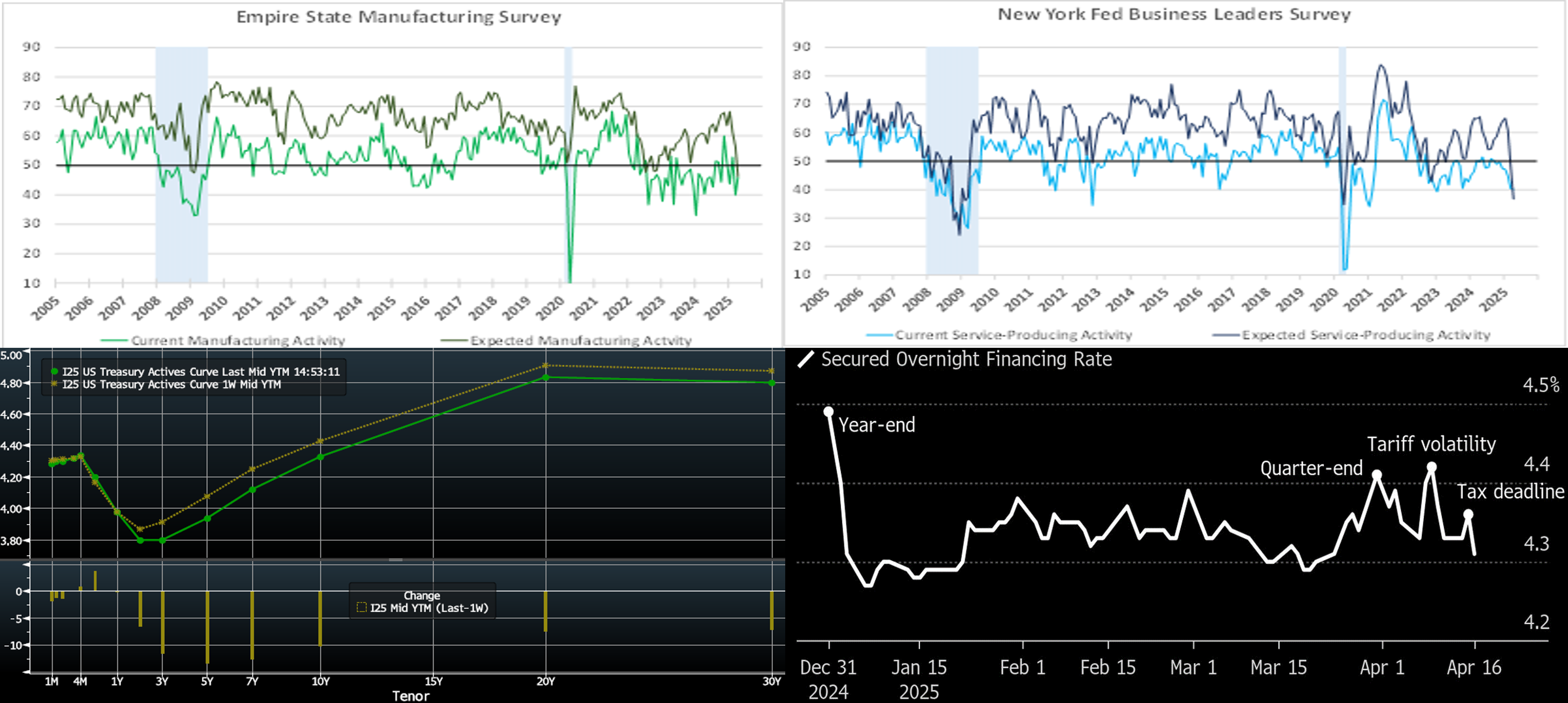 Source: Bloomberg. Top pane is yield (LHS, %); bottom pane is change (LHS, bps). At Thursday’s early market close, the UST term curve was lower vs. the week prior, led by the belly of the curve. The 2, 5, and 10-year declined by, respectively, 6, 12, and 10 bps. The tariff-induced liquidation in stocks, bonds, and credit has calmed notably, although financial condition metrics remain tighter than prior to the April 4th “tariff day”. Weaker-than-expected economic data also helped yields edge lower. As of Thursday’s close, the market prices end-2025 fed funds ~3.48%, or 4 bps higher than a week ago which equates to ~3.4 25-bps Fed cuts. The market’s end-2026 forward is ~3.12%, or 7 bps lower than a week ago.