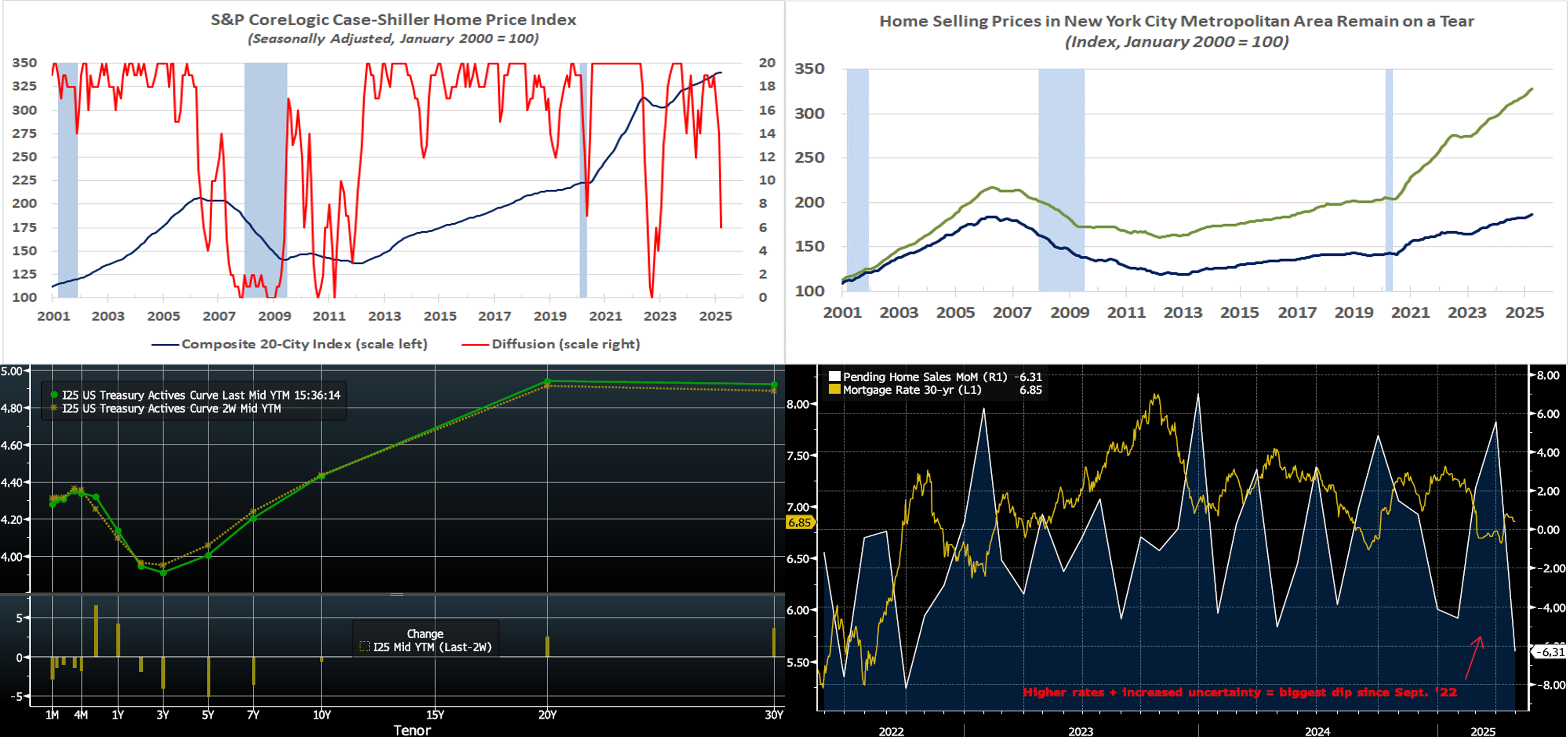 Source: Bloomberg. Focusing again on the housing sector, data this past week revealed potentially brewing weakness in home sales. The National Association of Realtors’ index of April pending home sales (White, RHS) declined by 6.3% month-on-month, which was the largest dip since September 2022 and was well under the consensus expectation for a 1% drop. This data, in addition to a weaker-than-expected Q1 GDP report, contributed to term rates falling 3 to 5 bps on Thursday morning. Sales declined in all four U.S. regions, with the West experiencing the biggest decline of 8.9%. Given that properties typically enter contract a month or two before the closing date, pending home sales are often viewed as a leading indicator of existing-home purchase data. A rise in mortgage rates (Gold, LHS, %), in tandem with the economic uncertainty and volatile markets driven by trade policy dynamics, likely contributed to the weakness. As is evident in the chart, this index is prone to rebounds, and so it remains to be seen if the relatively less volatile environment of the past few weeks will provide a boost to sales numbers.