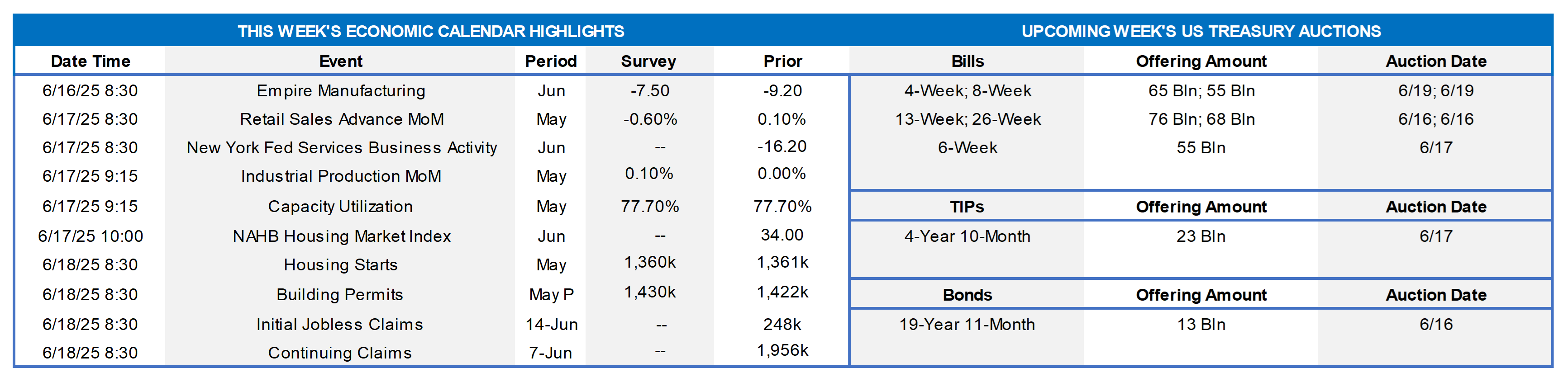 The June 18th Federal Open Market Committee (FOMC) meeting outcome will be the marquee event this coming week. The FOMC is universally expected to leave the federal funds rate target range unaltered at 4¼% to 4½%. The post-meeting communiqué likely will reiterate that while swings in net exports have impacted recent data, economic activity has continued to expand at a solid pace. Policymakers probably will note once again that the unemployment rate has stabilized at a low level in recent months, labor market conditions remain solid, but inflation remains somewhat elevated. The FOMC may repeat that uncertainty about the economic outlook remains high and that the risks of higher unemployment and higher inflation, or stagflation, are elevated. The FOMC will continue to its holdings of UST and agency debt and agency MBS. To date, runoffs of maturing securities have pared the System Open Market Account to $6.4trn from the $8.5trn peak reached in April 2022.
