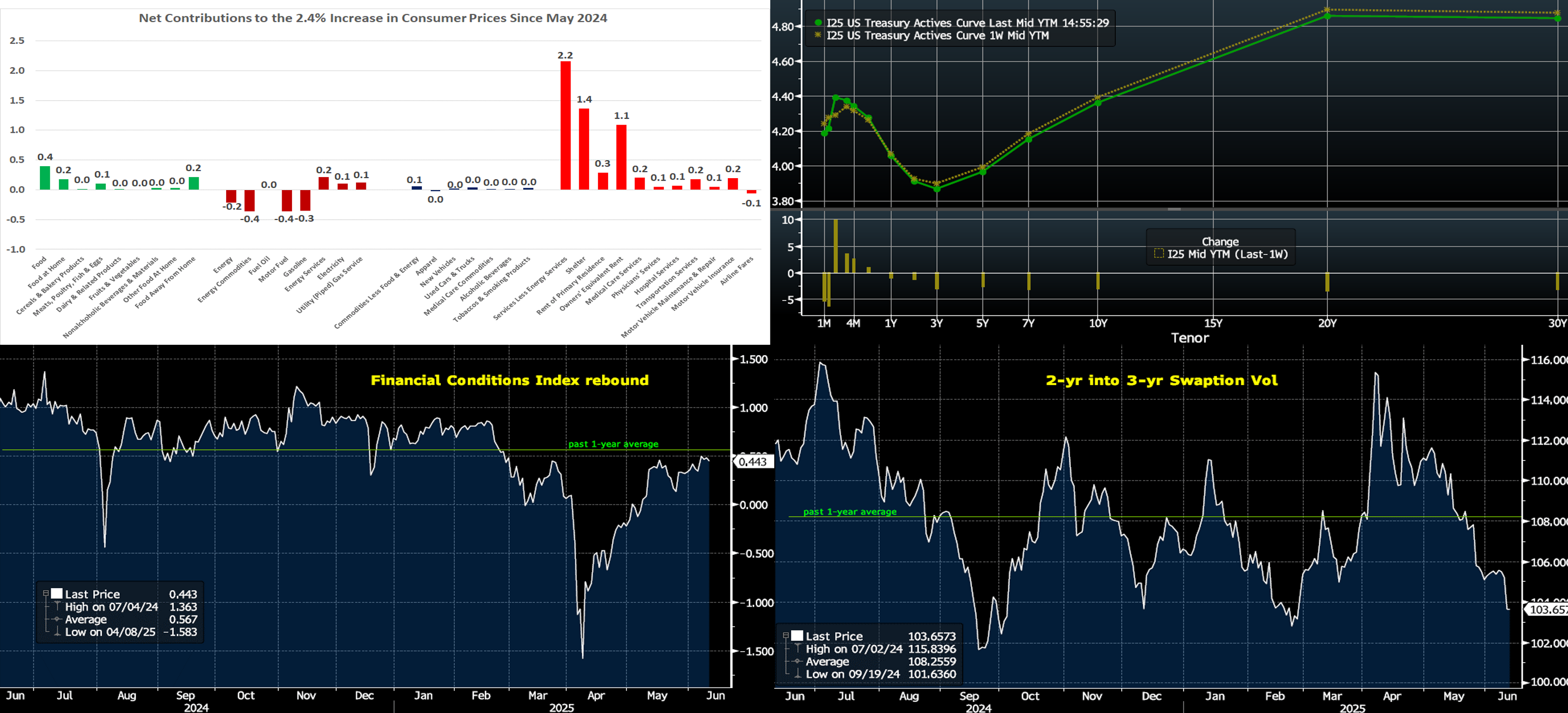 CHART 3 LOWER LEFT Sources: Bloomberg. The Bloomberg Financial Conditions Index (White, RHS) has staged a rebound in the past few months, in no small part due to an apparent course-correction from the most extreme path on tariff policy. This index tracks the overall level of stress in money, bond, and equity markets to help assess the availability and cost of credit. A positive value indicates accommodative conditions, whereas a negative value indicates tighter conditions. For the moment, markets have mostly recovered from the turmoil of April. Stocks have rebounded, credit spreads have tightened back from wider levels, and option volatility measures have declined from a prior spike. Bond yields are generally higher than two months ago but are down from higher levels; the 10-year UST, for instance, was ~4.60% on May 21st but is now ~4.36%. From the vantage point of financial conditions, the Fed would appear to have reason to remain on hold this week regarding official rates.