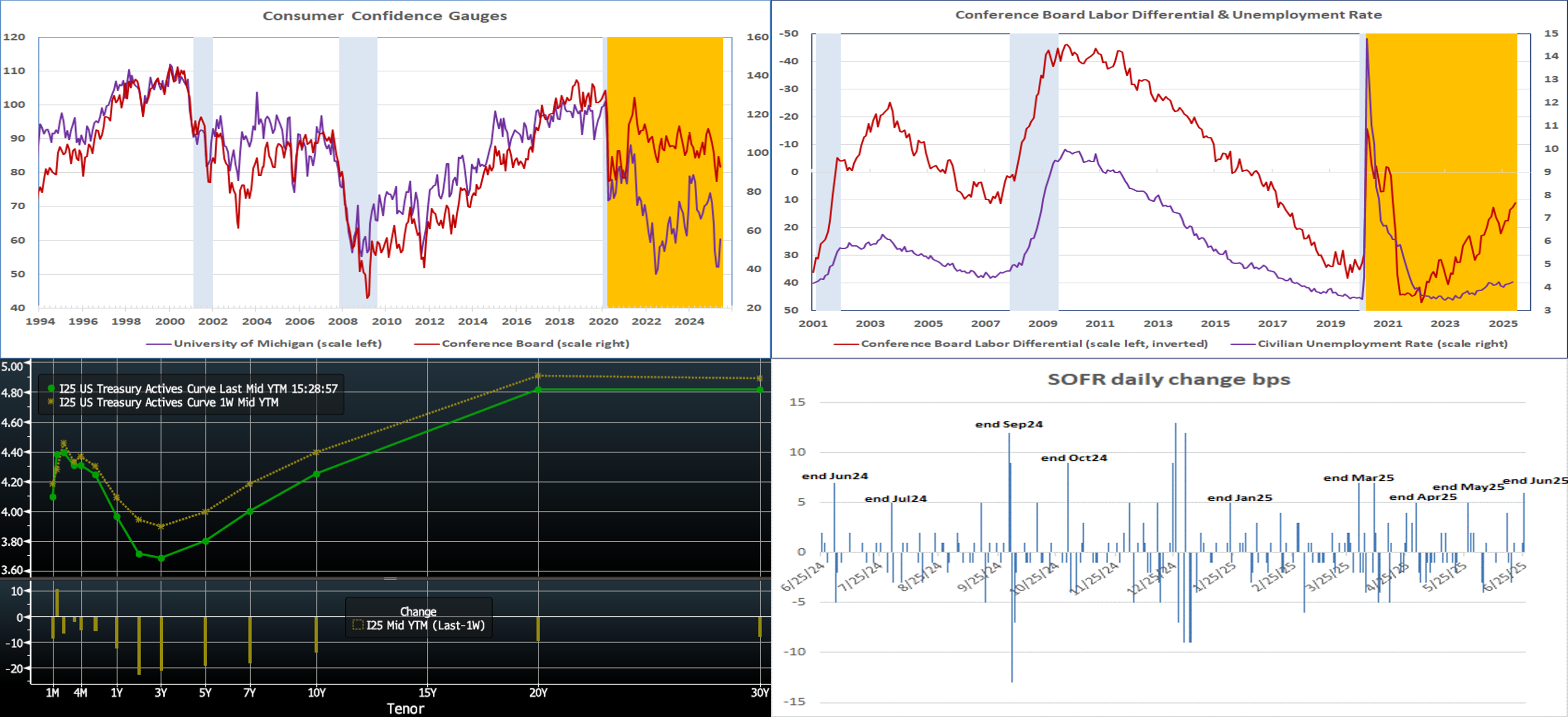 CHART 3 LOWER LEFT Sources: Bloomberg. Top pane is yield (LHS, %); bottom pane is change (LHS, bps). As of late Thursday, the UST term curve had trended lower from the week prior by 7 to 20 bps; the shorter tenors led the curve steepening move, with the 2-year lower by 20 bps. Economic data was generally softer than expected this past week. In addition to the Confidence numbers covered above, Thursday’s Q1 real GDP final revision was announced at -.5% vs. expectations of -.2%. Meanwhile, early-Thursday news stories of the Administration possibly fast-tracking a nomination announcement of a replacement for Fed Chair Powell sparked lower yields in the short end of the curve, as the market assumes any replacement will have a more dovish stance than Powell. Meanwhile, July 8th marks the end date of many of the tariffs put on pause; whether a further pause or a resolution is in store remains to be seen. As of late Thursday afternoon, the market prices end-2025 fed funds at 3.69%, or ~17 bps lower than a week ago. The market’s end-2026 forward is ~2.975%, or 22.5 bps lower than a week ago.
