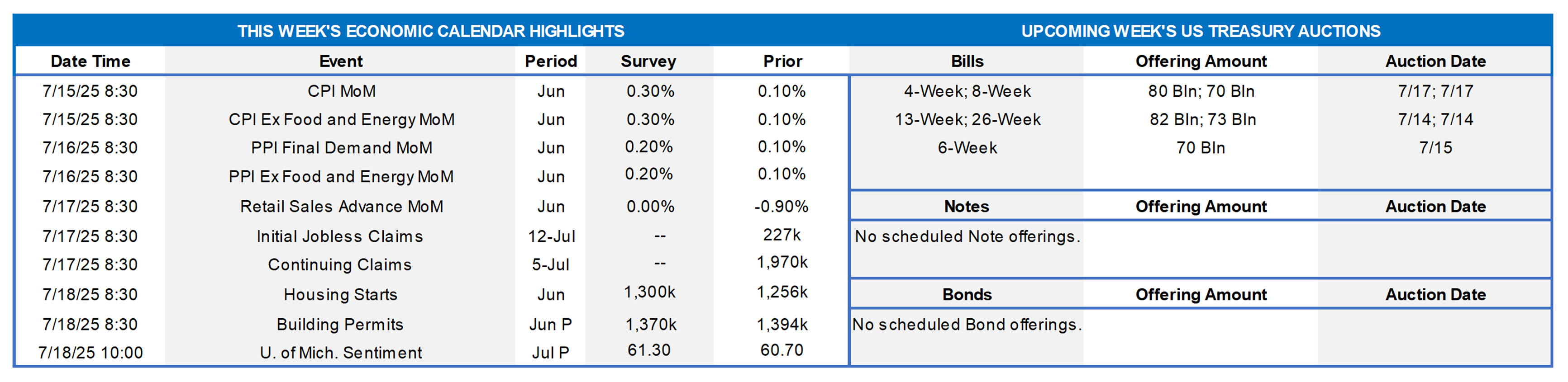 Consumer Price Index (CPI) report: The June reading for CPI is expected to reveal an uptick to .3% month-on-month vs. last month’s relatively benign .1% reading. Excluding the more volatile food and energy components, the core reading is also expected to be .30% rise vs. last month’s .1%. Chances are that the price pressures from tariff policy will be unclear, as the inventory buildup from Q1 is still to be depleted, and importers/sellers refrain from passing along costs yet.