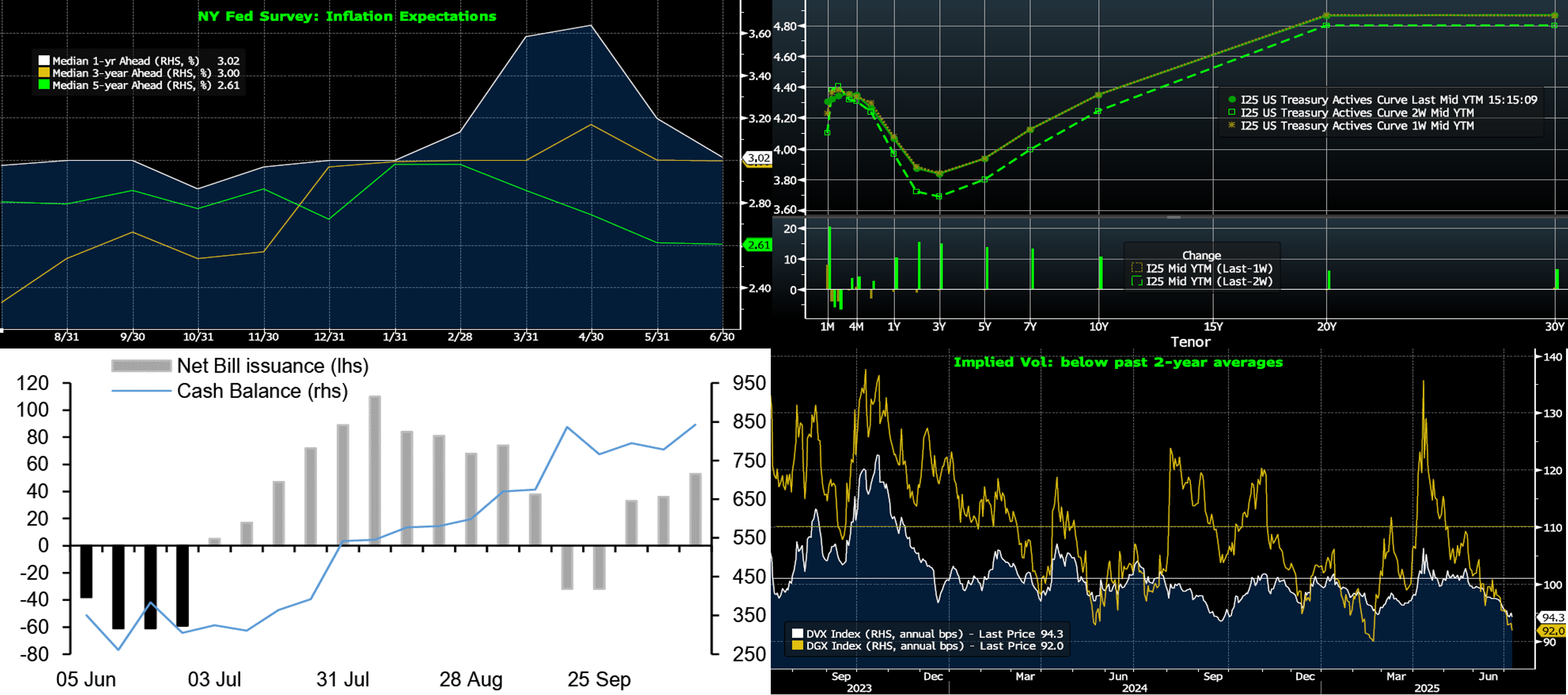Sources: Bloomberg. Top pane is yield (LHS, %); bottom pane is change (LHS, bps). As of late Thursday, the UST term curve was higher by 5 to 15 bps, with shorter tenors leading, from two Thursdays ago. The bulk of the move occurred in quick reaction to July 3rd’s jobs report, as the report was solid enough to notably dilute the market’s pricing of more aggressive Fed cuts. Since then, rates have held steady and the curve rests on top of its same position of a week ago. On the tariff front, the July 8th extended tariffs deadline has now been pushed to August 1st. At this point, markets appear to be shrugging off fresh tariff news, in an apparent view that tariffs will be diluted or delayed, and instead waiting for more definitive impacts on prices and economic growth. As of late Thursday afternoon, the market prices end-2025 fed funds at 3.82%, or ~13 bps higher than two weeks ago. The market’s end-2026 forward is ~3.12%, or 14.5 bps higher than two weeks ago.
