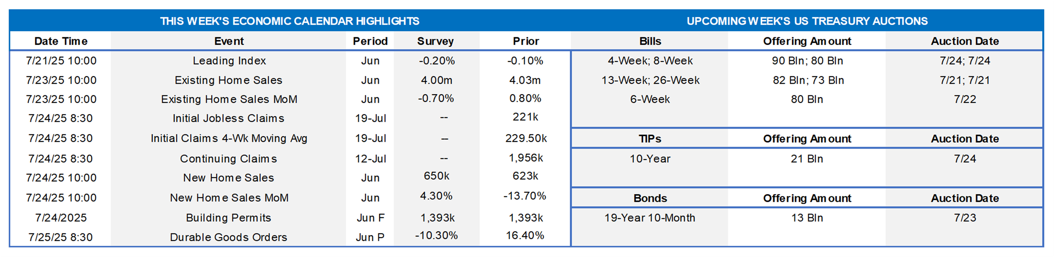 Durable Goods: The overall headline monthly orders figure for June is expected to significantly retreat from May, owing to the prior month’s hefty increase being heavily driven by transportation-related orders. Indeed, last month’s ex-transportation figure was +.5%, and this month’s forecast is for a flat reading.