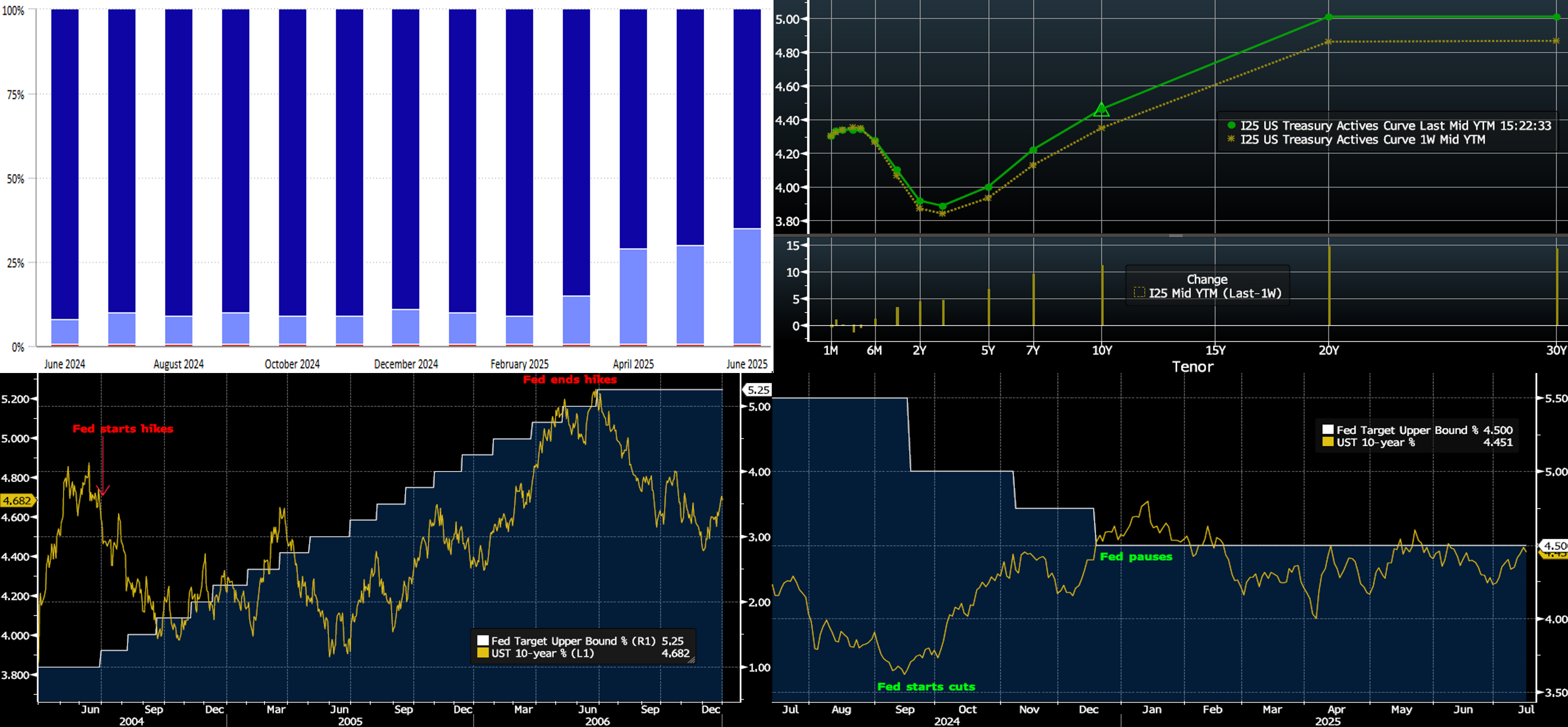 Sources: Bloomberg. Top pane is yield (LHS, %); bottom pane is change (LHS, bps). As of late Thursday, the UST term curve was higher and steeper than the week prior. While 2- and 3-year yields were up by ~5 bps, the 5- and 10-year yields were ~7 and 11 bps higher, respectively. With the week’s data seemingly supportive of a Fed “wait and see” mode, the market pared back its pricing of projected rate cuts. Meanwhile, headlines regarding Fed Chair Powell’s status generated a steepening impetus to the curve, owing to concerns about Fed independence, and led to the 30-year UST piercing the 5% level. At this juncture, markets appear to be shrugging off fresh tariff news, in an apparent view that tariffs will be diluted or delayed, and instead waiting for more definitive impacts on economic trends. As of late Thursday afternoon, the market prices end-2025 fed funds at 3.915%, or ~9.5 bps higher than a week ago. The market’s end-2026 forward is ~3.165%, or 4.5 bps higher than last week.